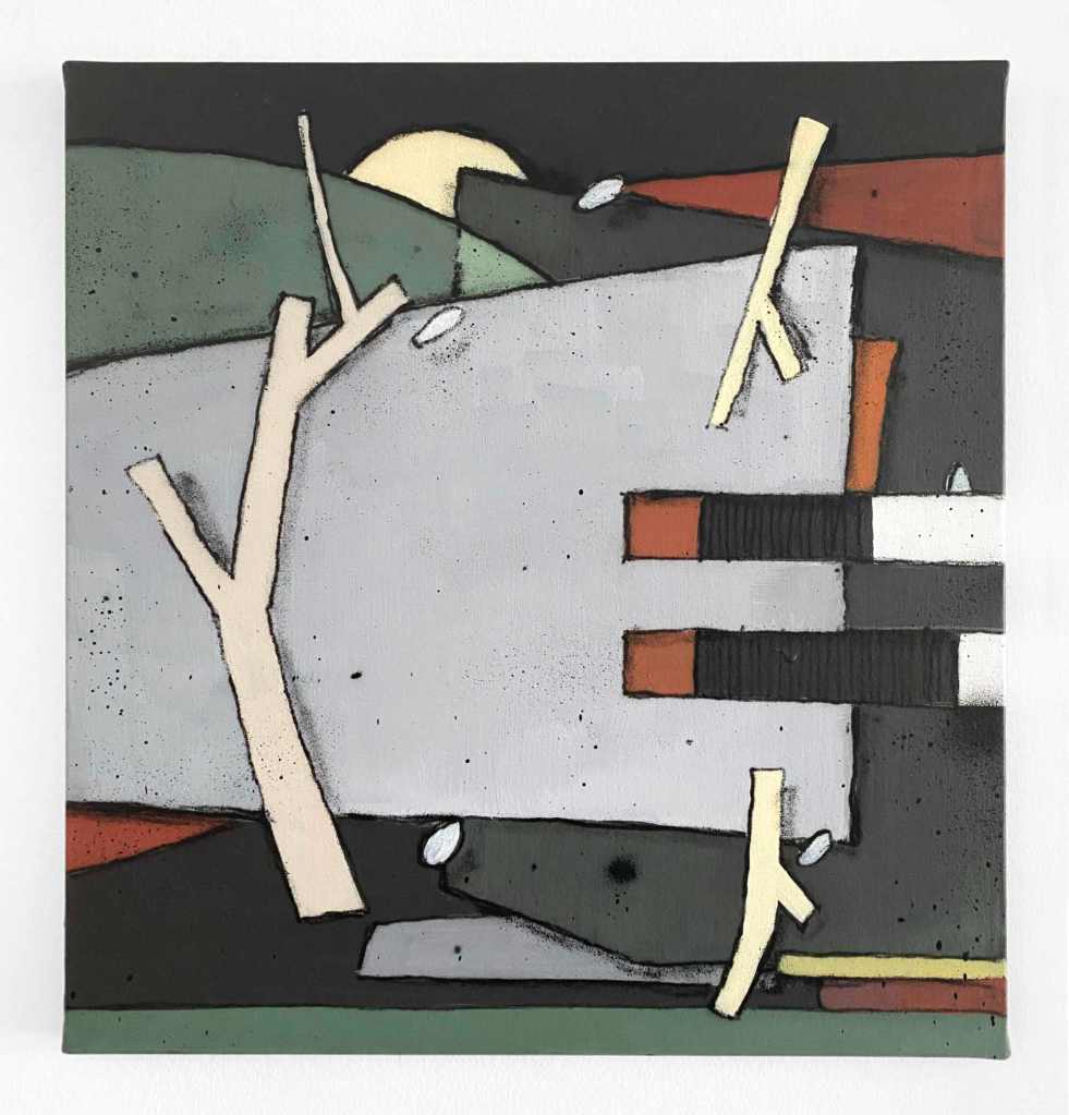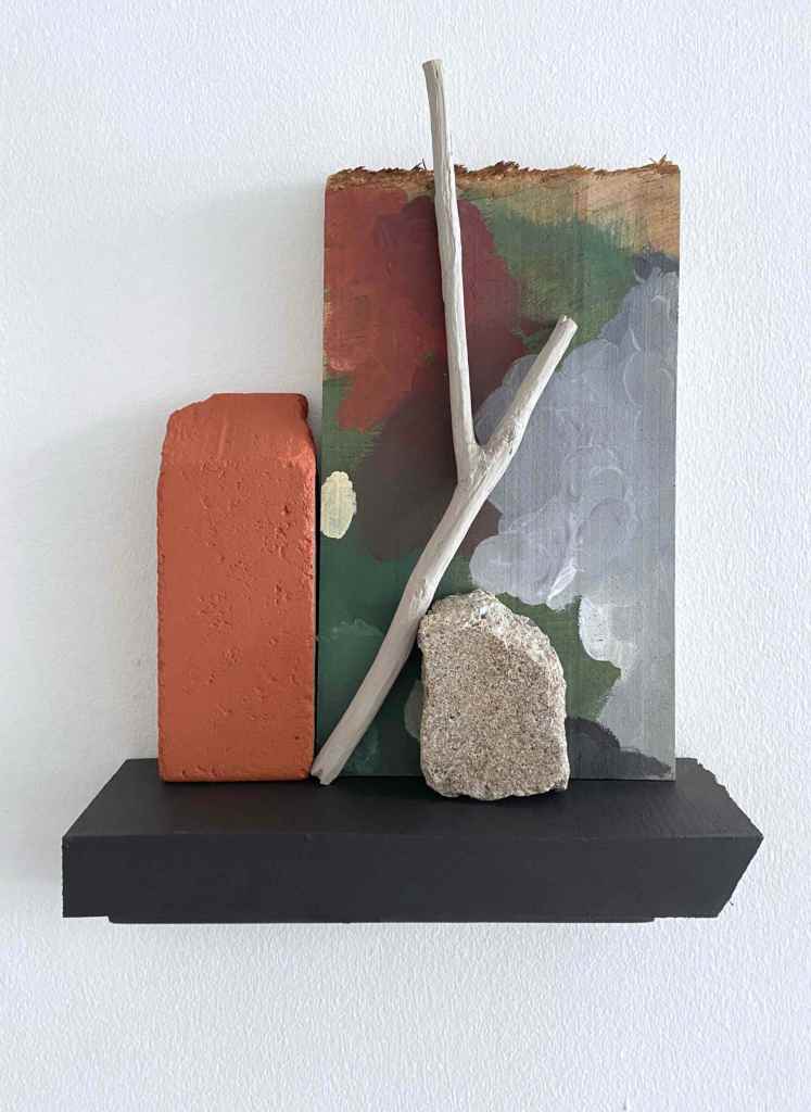 En atelier, jโai recomposรฉ cette mรฉmoire ร partir de cette photo et dโรฉlรฉments glanรฉs sur place. Le triptyque qui en rรฉsulte fragmente lโลuvre initiale, sans chercher ร la reproduire, mais ร en conserver lโessence et lโinstantanรฉitรฉ.Une installation accompagne la sรฉrie : les objets prรฉlevรฉs et la palette de couleurs utilisรฉe y deviennent des reliques, tรฉmoins silencieux du contexte qui ont inspirรฉ la crรฉation.