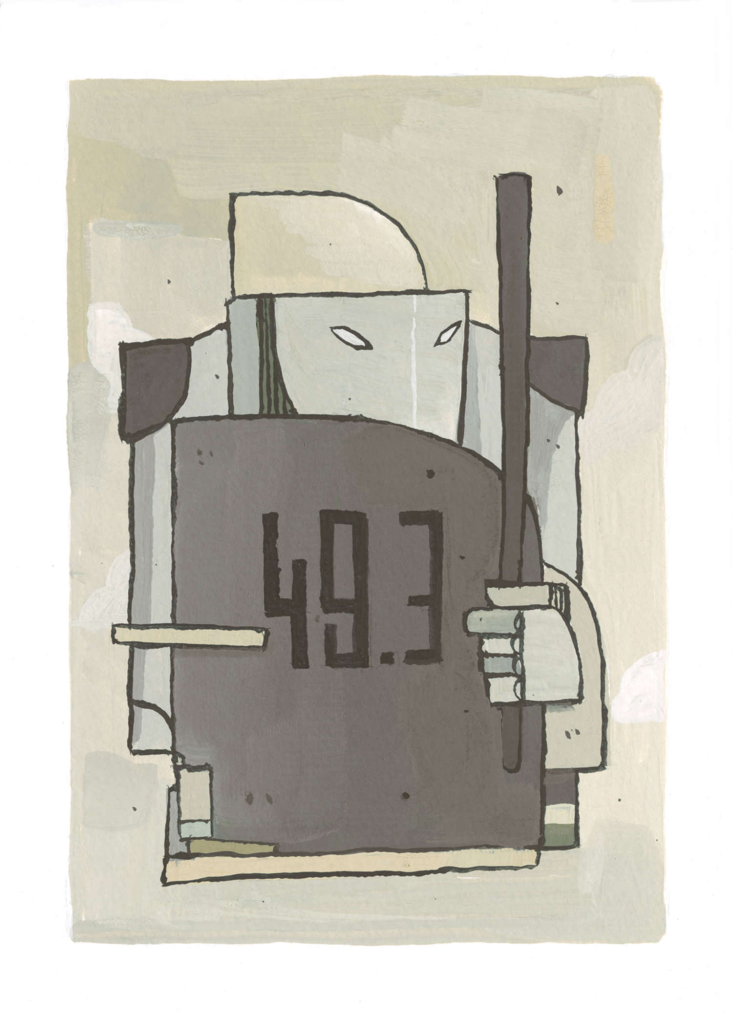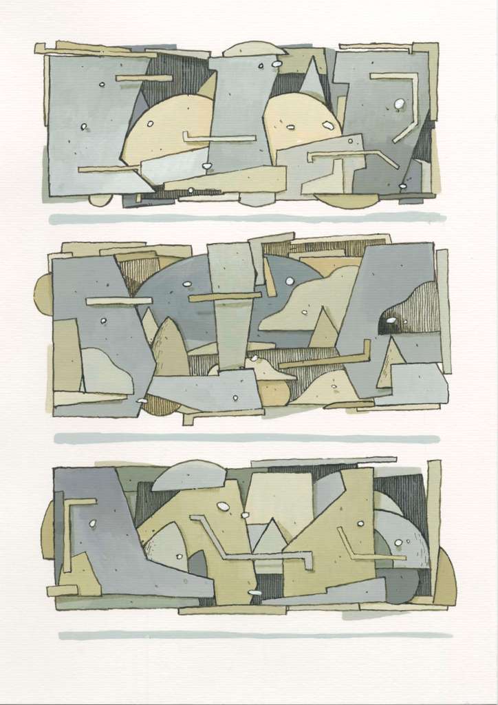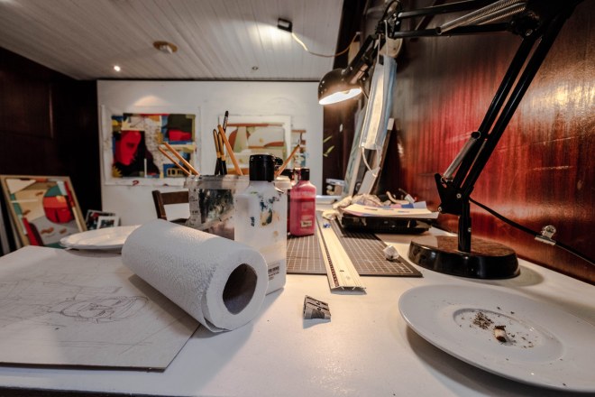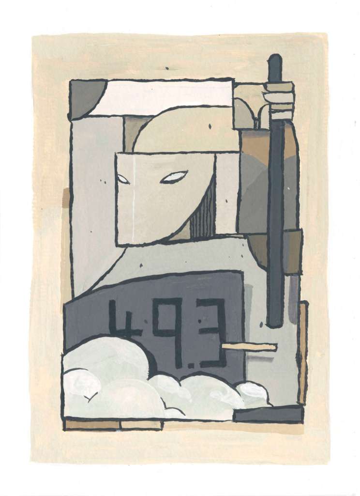 Jโy passe une matinรฉe, seul, avec un matรฉriel minimaliste : quatre bouteilles de peinture primaire et une bombe dโaรฉrosol. Dans lโun des bรขtiments, une piรจce en grande partie vandalisรฉe rรฉvรจle un mur en parpaing de bรฉton, dissimulรฉ derriรจre un mur de briques rouges en terre cuite, aujourdโhui dรฉtruit et effondrรฉ ร ses pieds. Le gris des parpaings et le rouge terre cuite des briques deviennent la base chromatique de cette future peinture. Sur place, je rรฉcupรจre quelques รฉlรฉments qui mโinspirent, ainsi quโune planche qui me servira de palette.