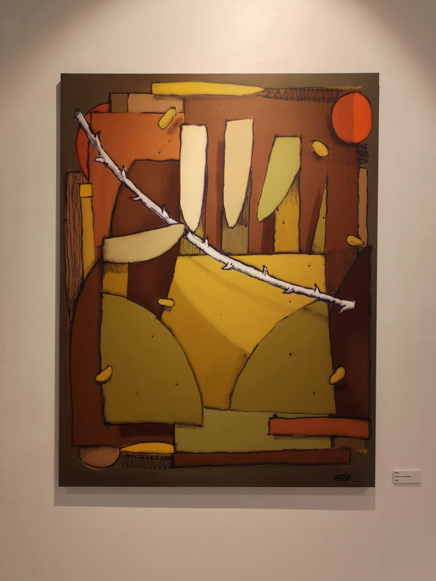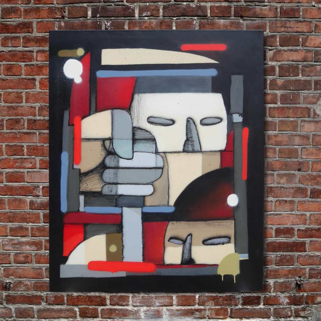 Acrylique et aรฉrosol sur toile mixte enchรขssรฉe, caisse amรฉricaine en chรชne Format 130*97 cm.