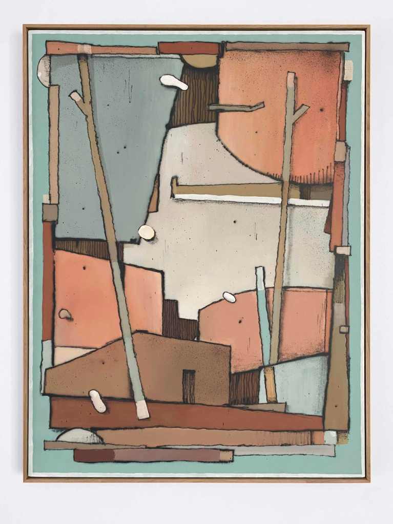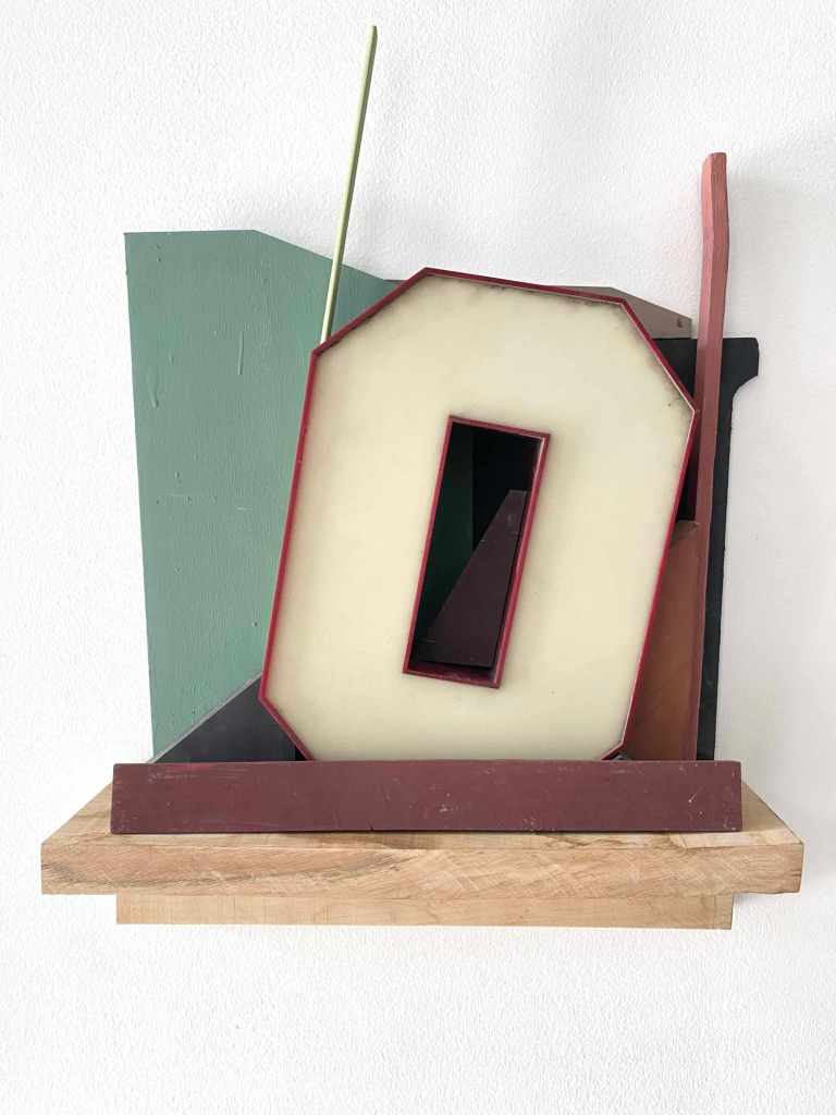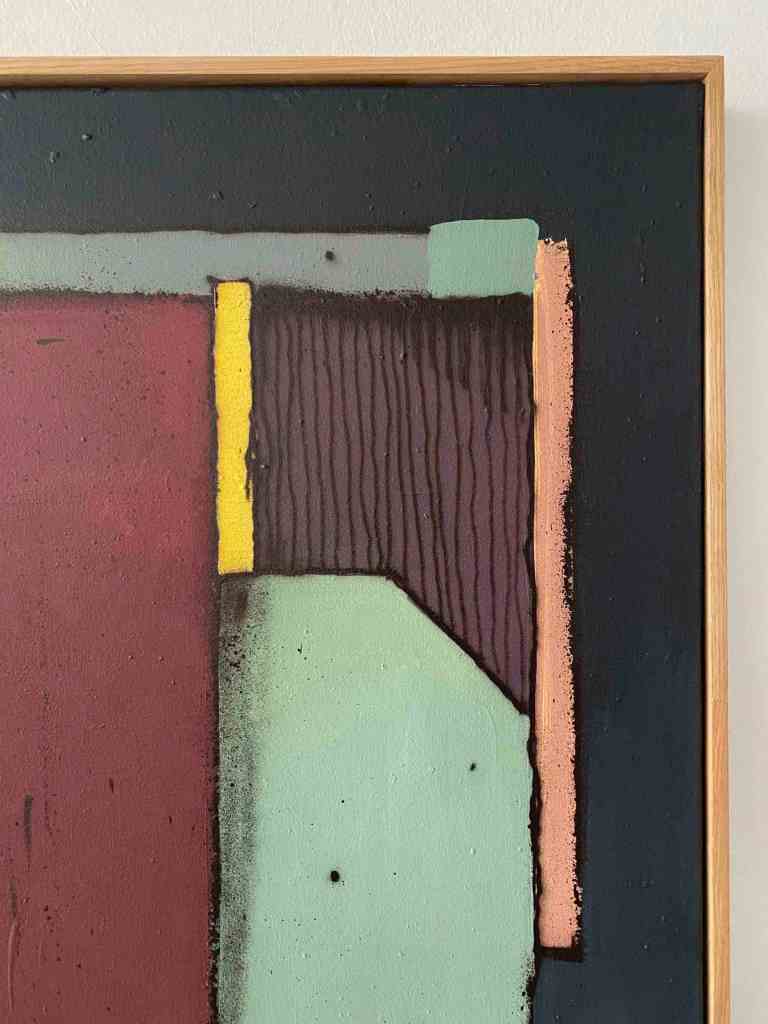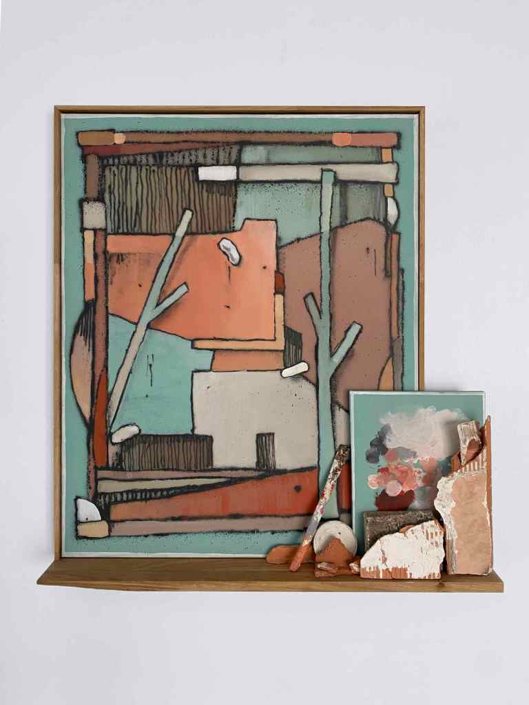 Acrylique et aรฉrosol sur toile mixte enchรขssรฉe ,tablette en chรชne , brique creuse, parpaing, pinceau, acier, toile lin Format 3P, Caisse amรฉricaine en chรชne Format 92*73 cm.