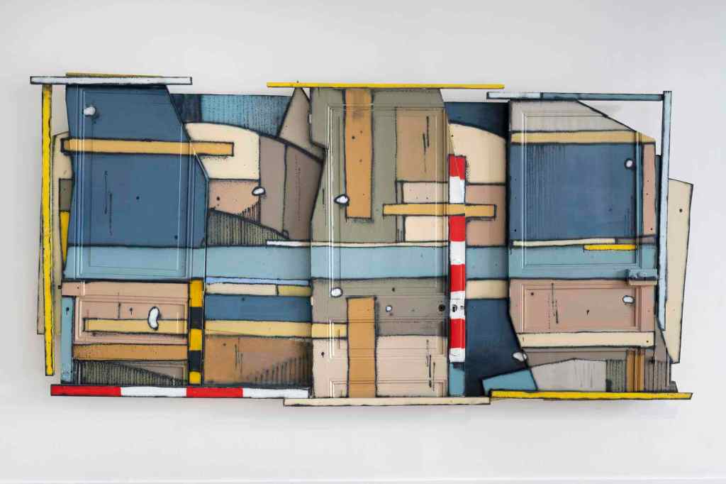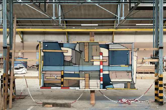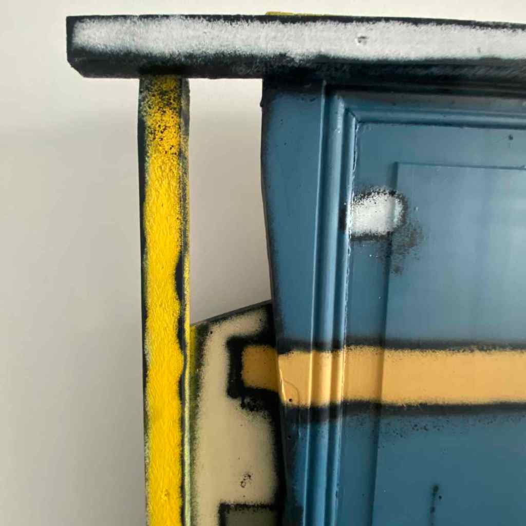 Cela faisait longtemps que je souhaitais traduire en volume mes lettrages abstraits. Lโexposition Framework mโa permis dโexpรฉrimenter cette idรฉe. Ici, les supports โ รฉlรฉments de porte et divers panneaux de rรฉcupรฉration โ sโintรจgrent ร la composition. Les matรฉriaux sont prรฉlevรฉs et dรฉcoupรฉs sur place, et la peinture est รฉgalement composรฉe dans lโespace de crรฉation, une ancienne halle industrielle. Une photo, prise dans cet espace, tรฉmoigne de ce processus.