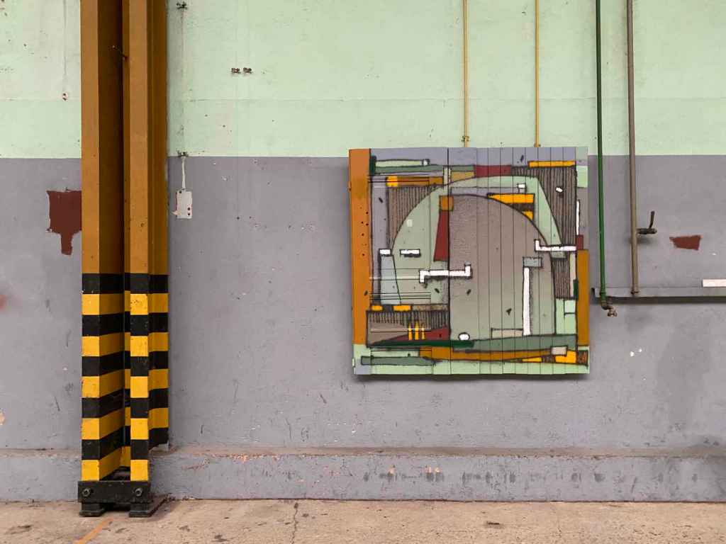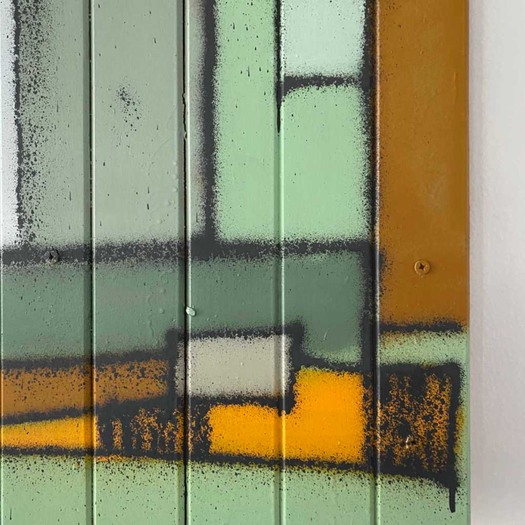 Cette peinture fait partie dโune sรฉrie de deux ลuvres rรฉalisรฉes dans une halle industrielle. Elles suivent le mรชme processus : les matรฉriaux constituant les supports ont รฉtรฉ prรฉlevรฉs sur place, et le cadrage met en scรจne une composition qui dialogue avec lโespace sรฉlectionnรฉ. La photographie finale accompagne lโartefact et documente le protocole de crรฉation.