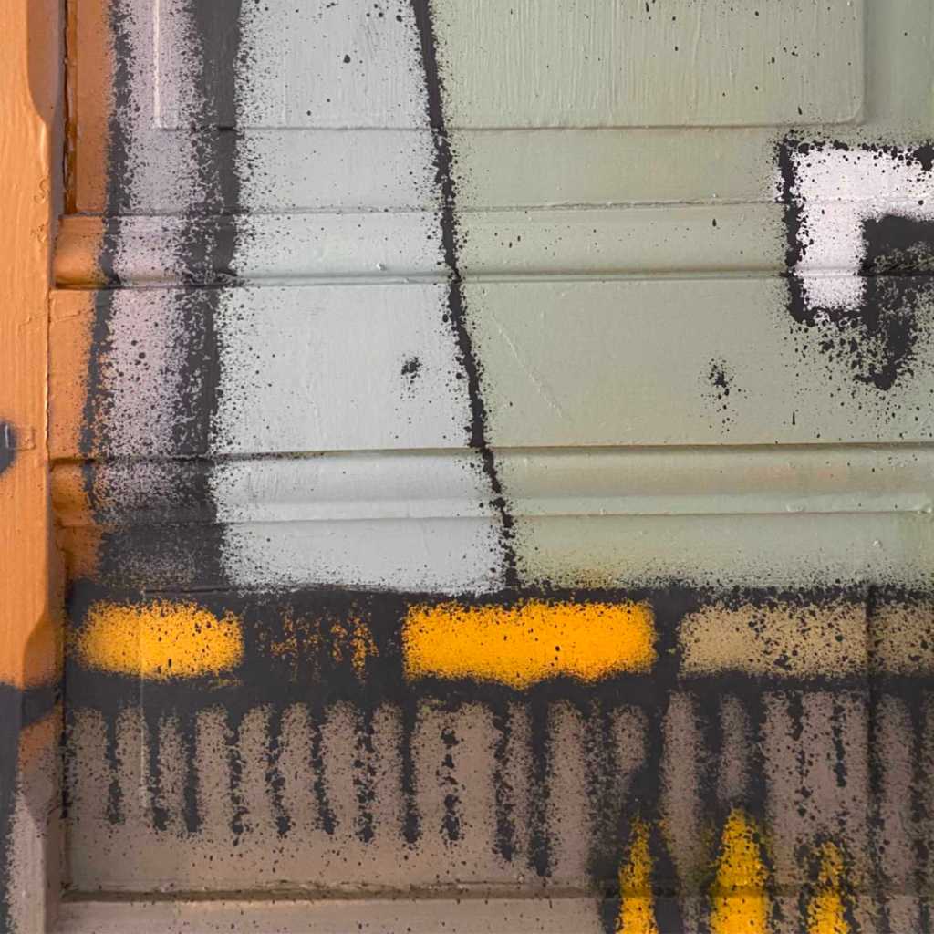 En 2023, jโai investi une piรจce close de ce mรชme bรขtiment, recouverte dโune vieille tapisserie dรฉfraรฎchie, pour y crรฉer une nouvelle ลuvre ร partir de fonds de peinture et de bombes aรฉrosol. Frappรฉ par lโรฉquilibre de cette composition รฉphรฉmรจre, jโen ai extrait lโesprit visuel โ sans en reprendre les lettres ni les motifs โ pour en proposer une rรฉinterprรฉtation abstraite.