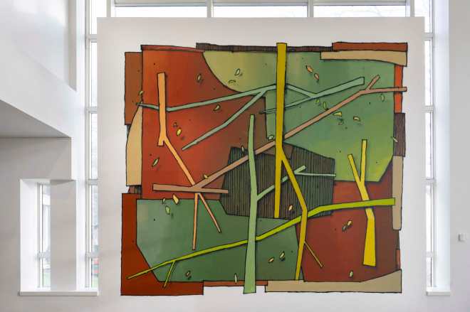 At the request of the Galerie Pictura, I have been invited to take over one of the walls of this long white cube. It is a large white square framed by narrow openings overlooking Bourgchevreuil Park. It is difficult to create a contextual painting in such a neutral space.