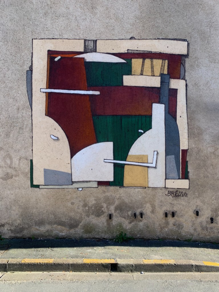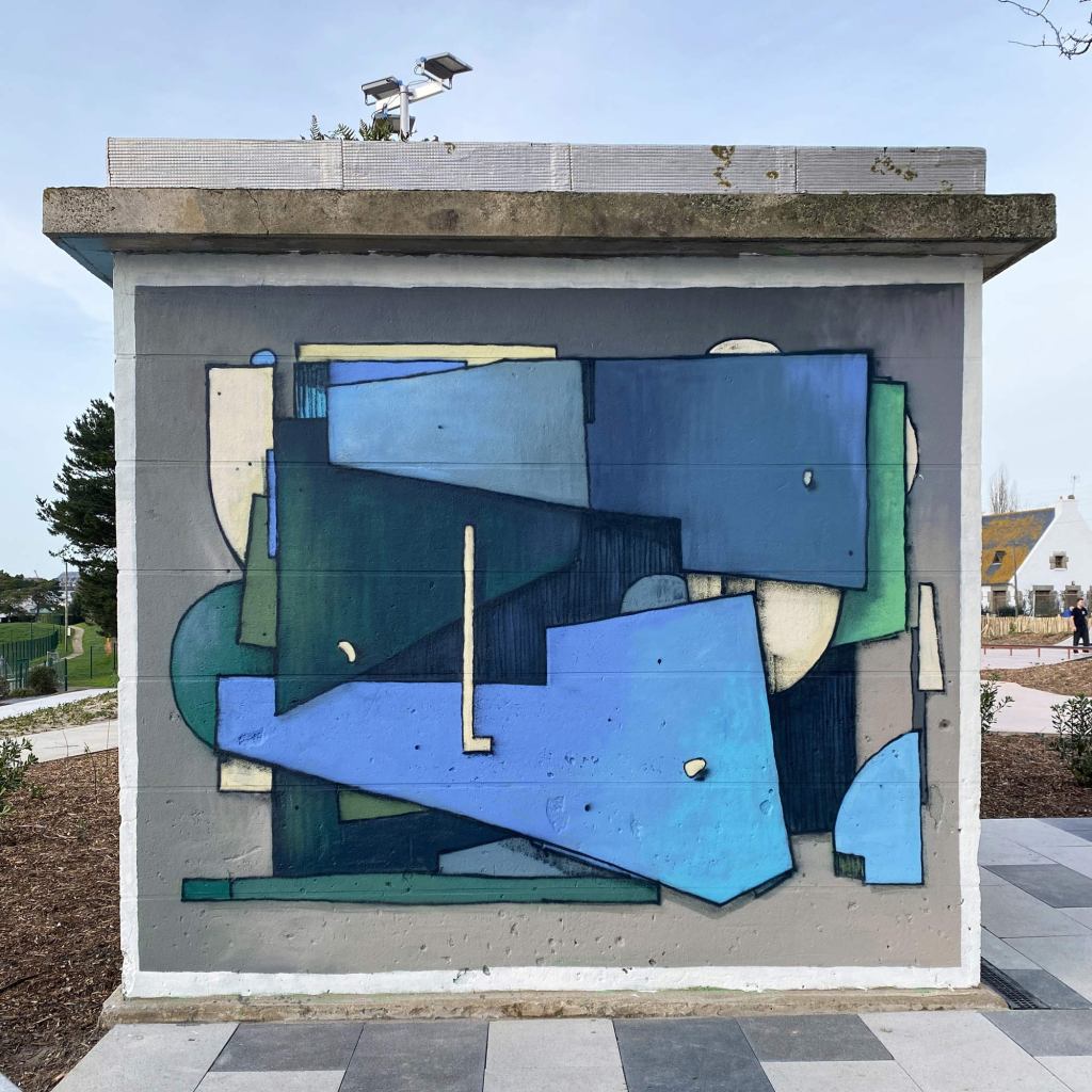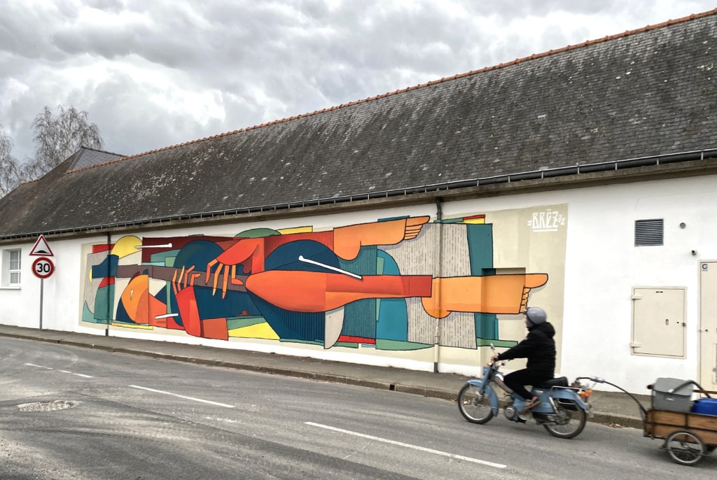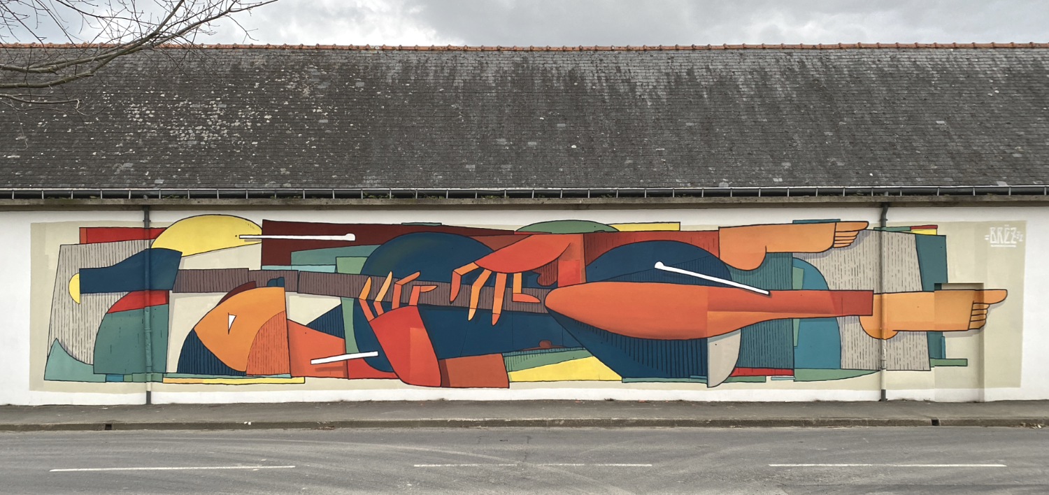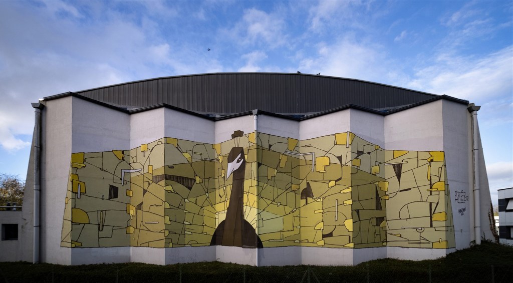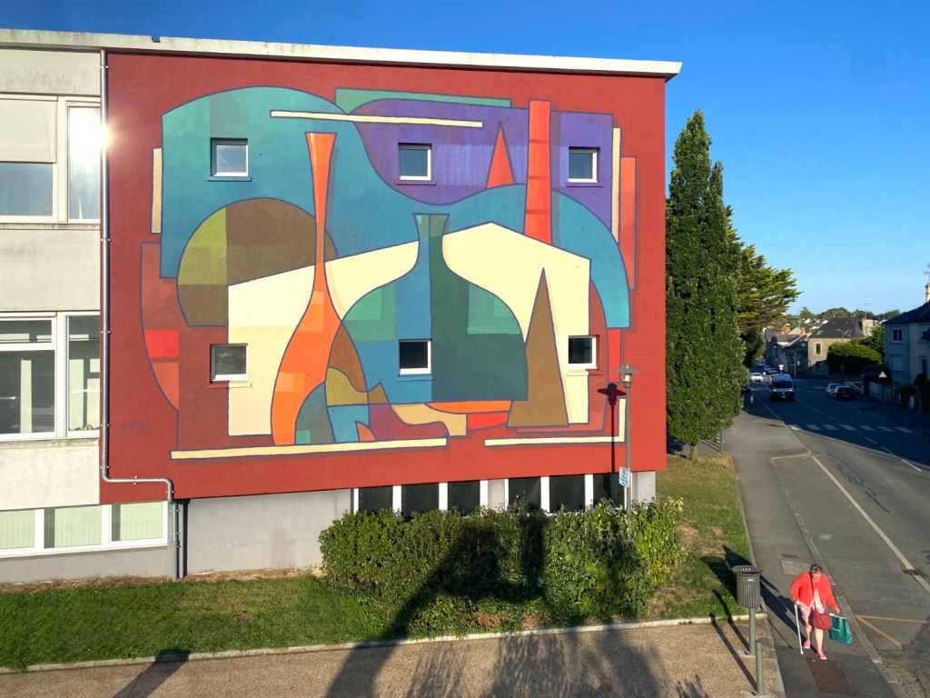 Commissioned by the city of Fougรจres, the painting evokes the site’s industrial past, which saw the Fougeraise crystal factory followed by shoe manufacturing workshops in the last century. It has now been converted into a community centre.
