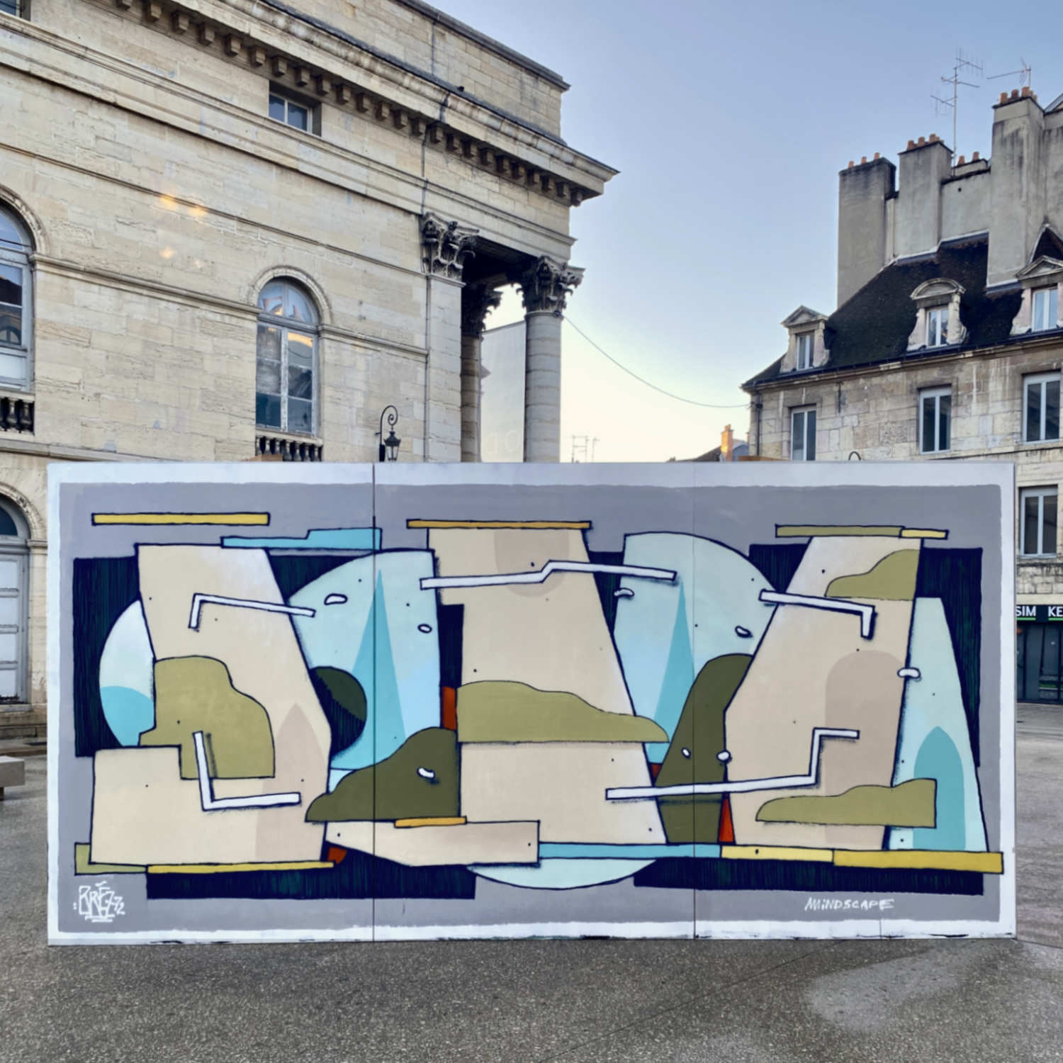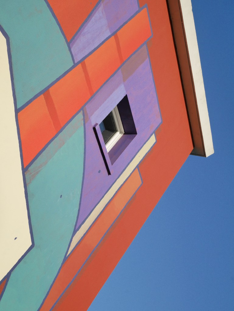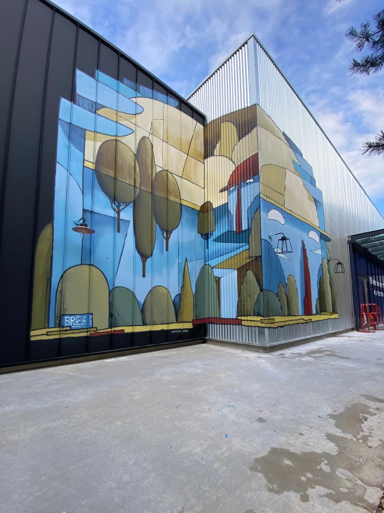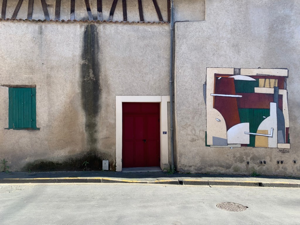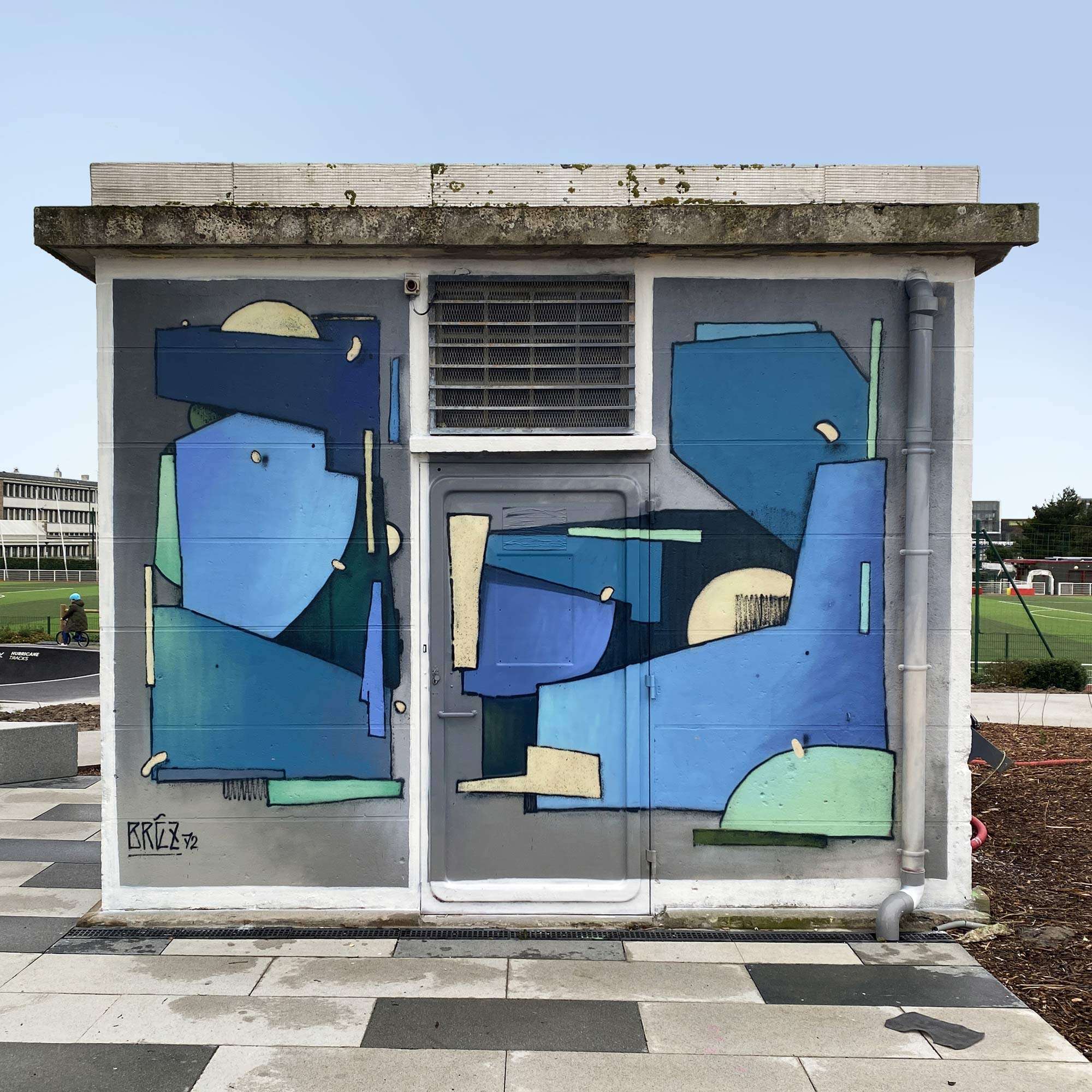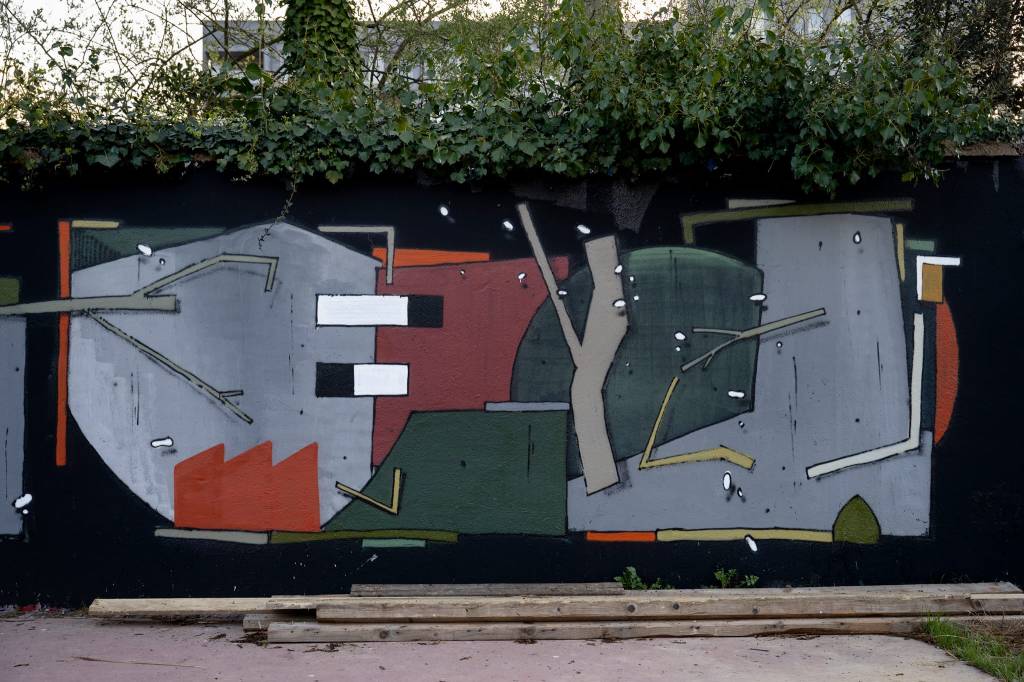 Commissioned by the city of Fougรจres, the painting evokes the site’s industrial past, which saw the Fougeraise crystal factory followed by shoe manufacturing workshops in the last century. It has now been converted into a community centre.