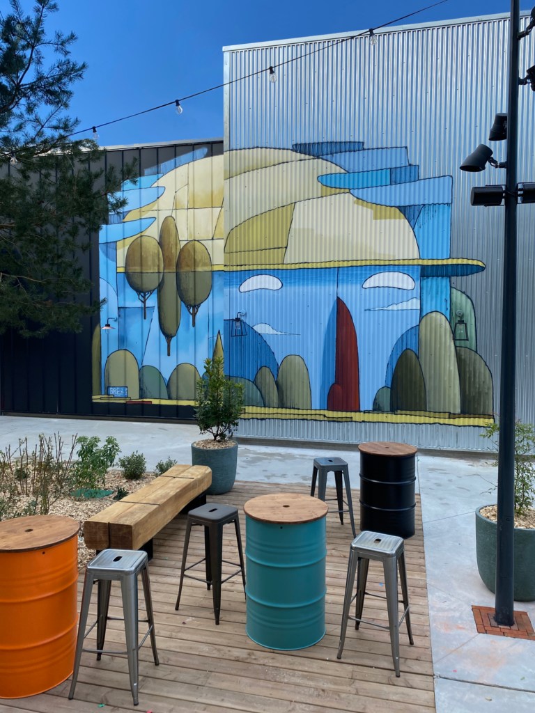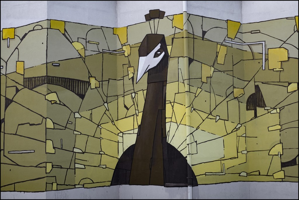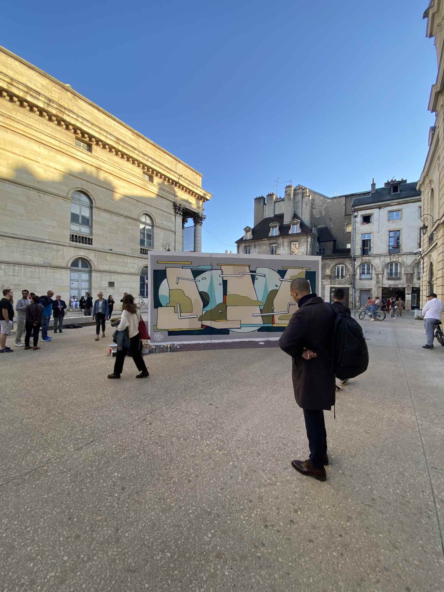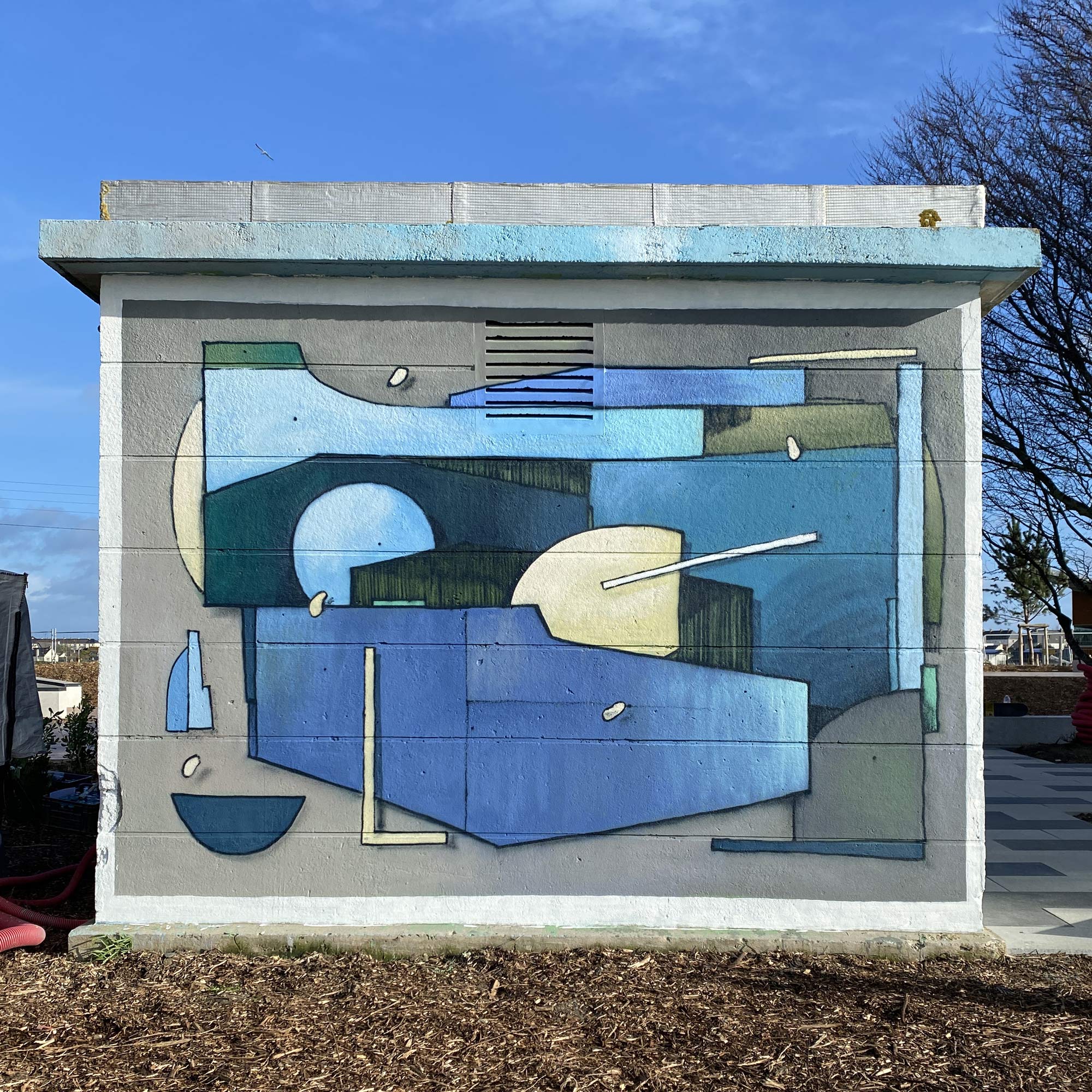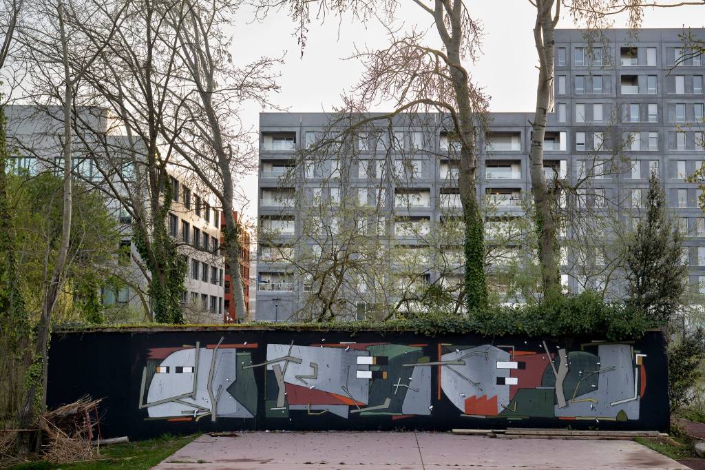 Commissioned by the city of Fougรจres, the painting evokes the site’s industrial past, which saw the Fougeraise crystal factory followed by shoe manufacturing workshops in the last century. It has now been converted into a community centre.