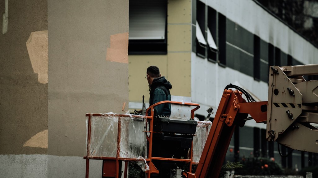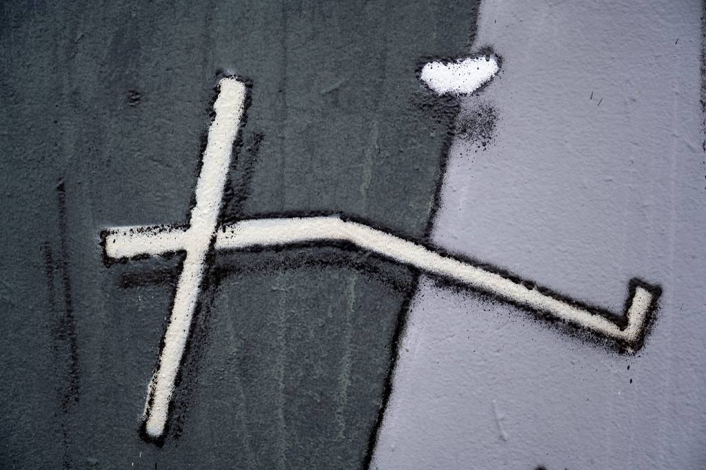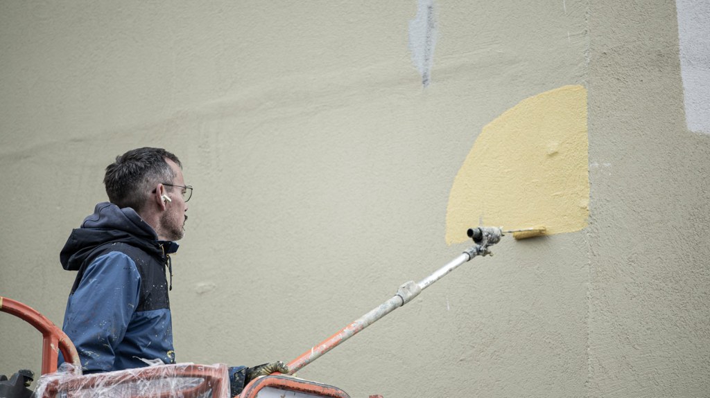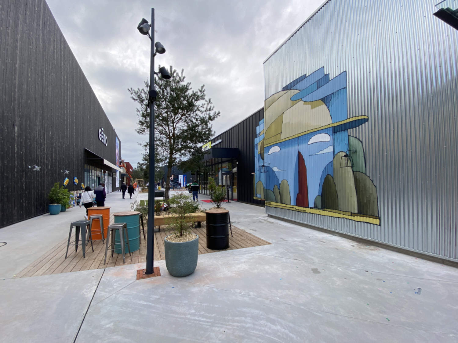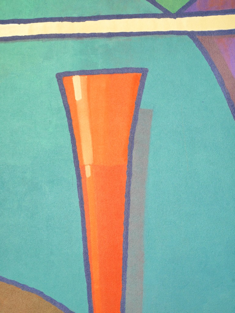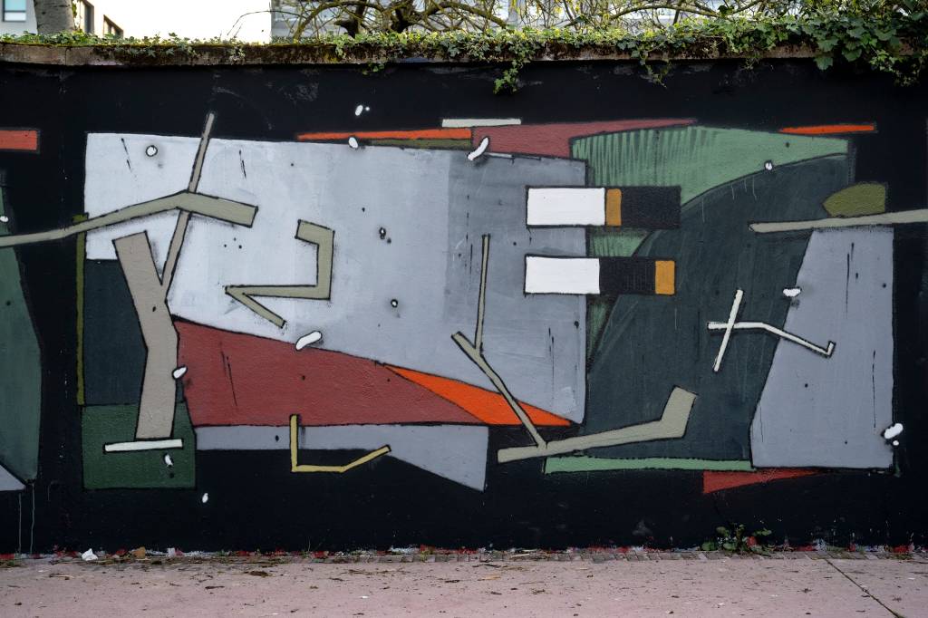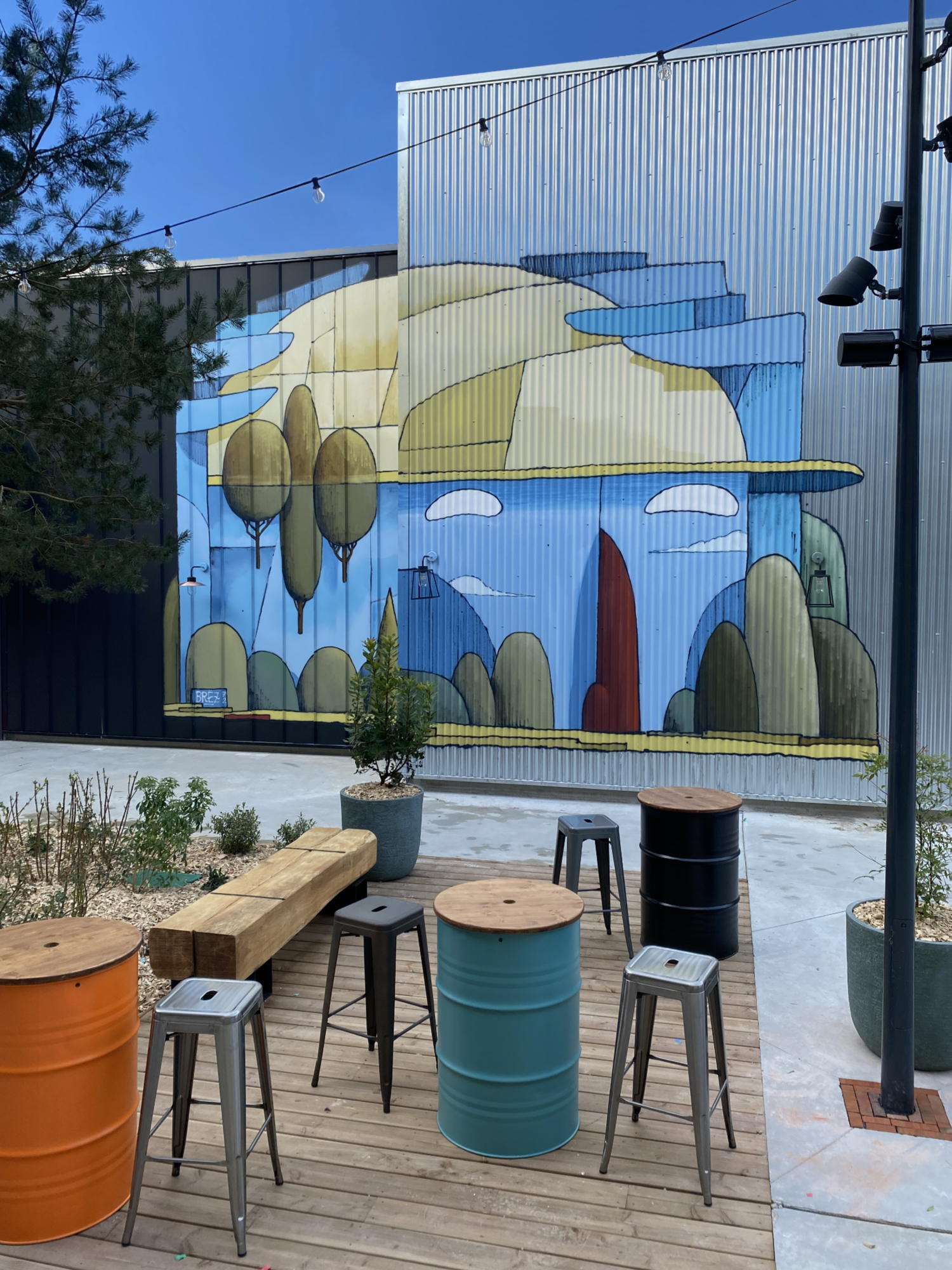 Commissioned by the city of Fougรจres, the painting evokes the site’s industrial past, which saw the Fougeraise crystal factory followed by shoe manufacturing workshops in the last century. It has now been converted into a community centre.