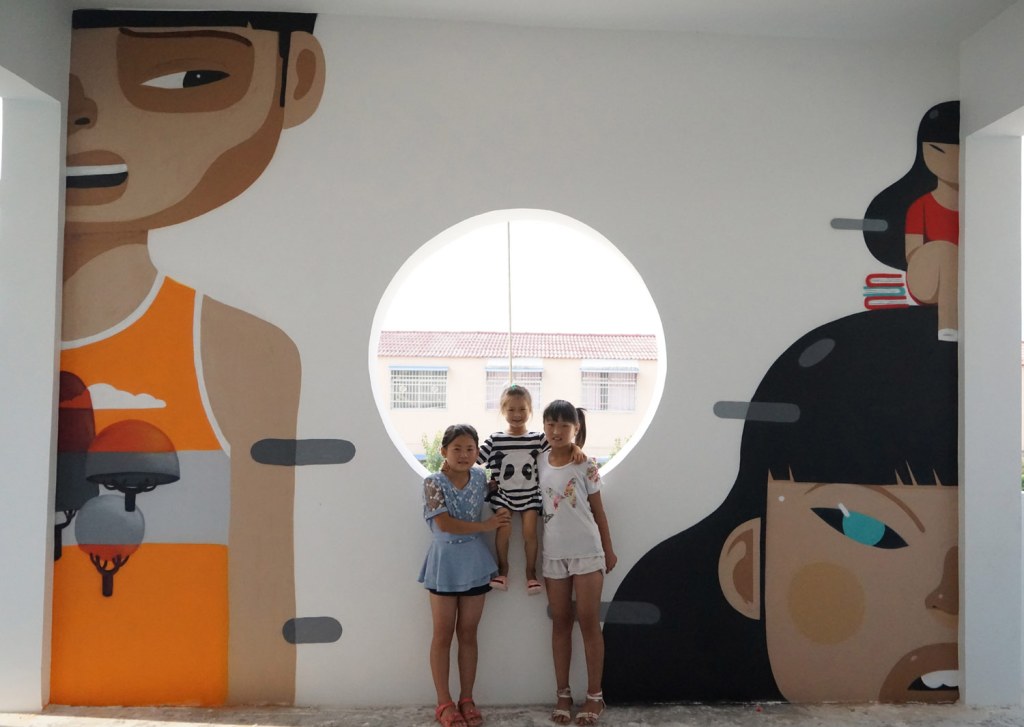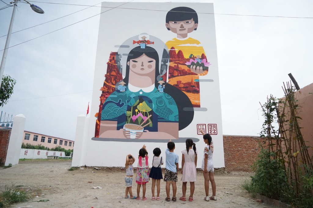Here is a wall we do with my friend Dino Voodo in China for “Back to school” event. We was invited by SETH for this program, we have to paint a wall in countryside in the middle of China, near from Zhumadian. So we do this two charachter’s for illustrate an old tales from south China, we called it “The bird and the fisherman”.