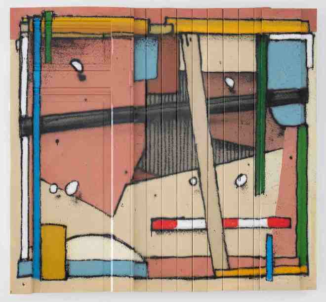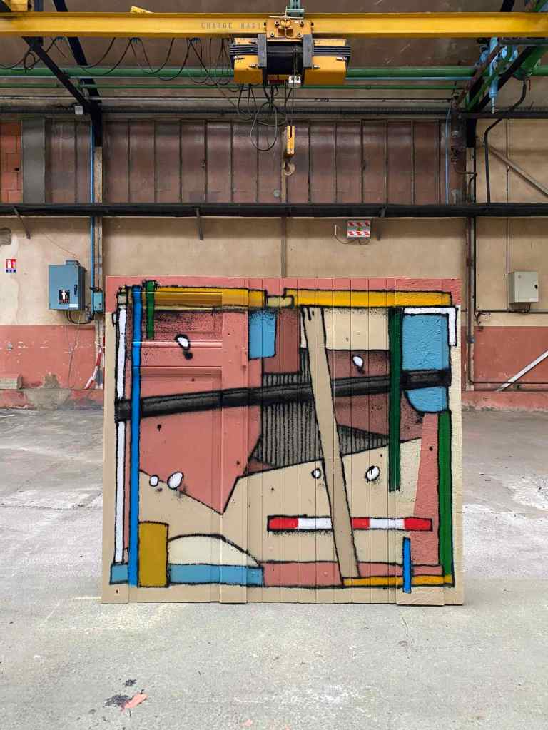 Cela faisait longtemps que je souhaitais traduire en volume mes lettrages abstraits. Lโexposition Framework mโa permis dโexpรฉrimenter cette idรฉe. Ici, les supports โ รฉlรฉments de porte et divers panneaux de rรฉcupรฉration โ sโintรจgrent ร la composition. Les matรฉriaux sont prรฉlevรฉs et dรฉcoupรฉs sur place, et la peinture est รฉgalement composรฉe dans lโespace de crรฉation, une ancienne halle industrielle. Une photo, prise dans cet espace, tรฉmoigne de ce processus.