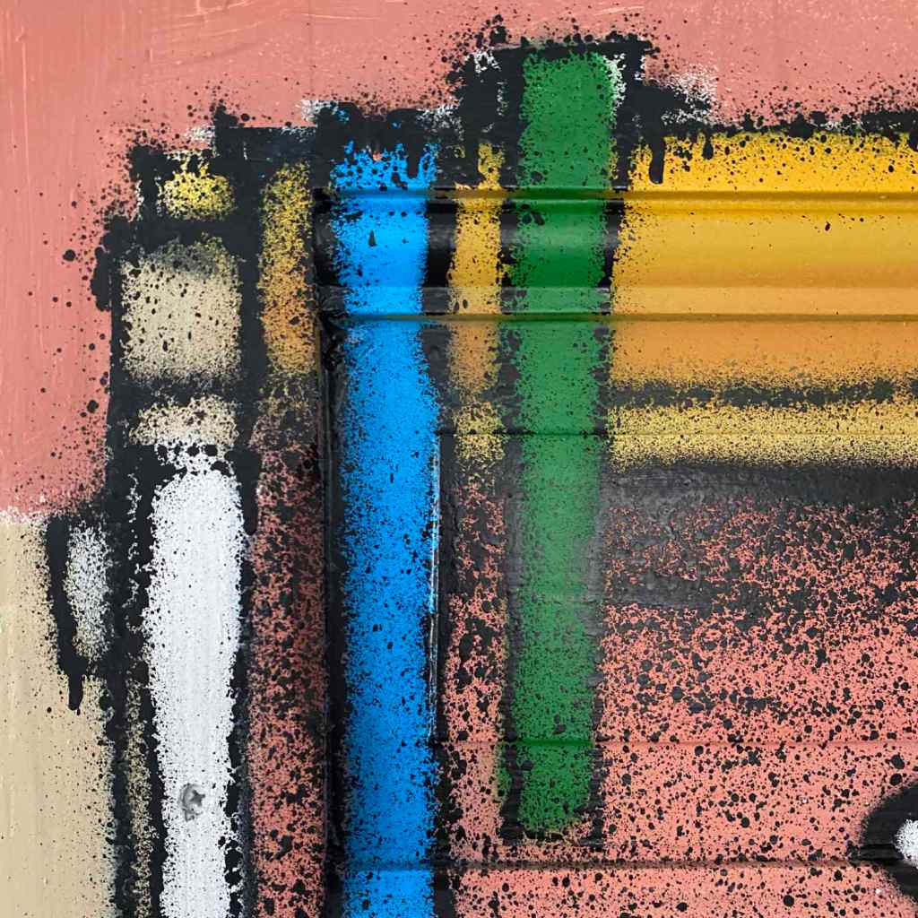 En 2023, jโai investi une piรจce close de ce mรชme bรขtiment, recouverte dโune vieille tapisserie dรฉfraรฎchie, pour y crรฉer une nouvelle ลuvre ร partir de fonds de peinture et de bombes aรฉrosol. Frappรฉ par lโรฉquilibre de cette composition รฉphรฉmรจre, jโen ai extrait lโesprit visuel โ sans en reprendre les lettres ni les motifs โ pour en proposer une rรฉinterprรฉtation abstraite.