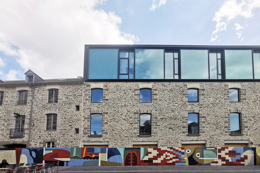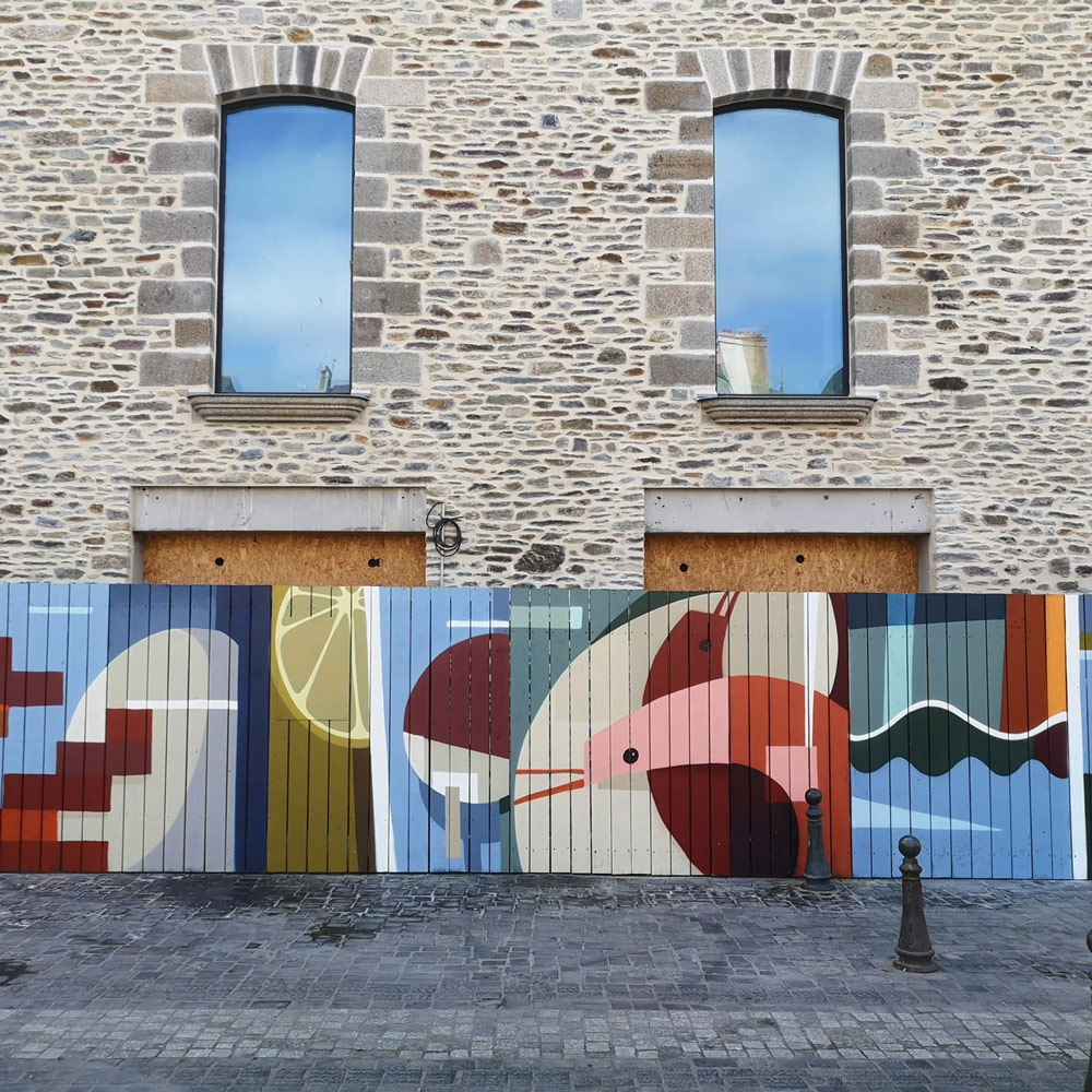 On the occasion of the 400th birthday of the famous Lices market in Rennes, and at the invitation of Destination Rennes, we have been invited with BIMS to perform a painting on a building site palisade. For the composition, I wished to be influenced by the furniture and the architecture that makes the singularity of this high place of the local gastronomy. A semiabstract painting that also suggests specific products of the market.